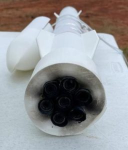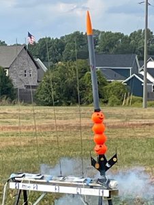 3) A dual A8 cluster started the launch, and one guy 3D printed a New Glenn, which was powered by a cluster of 7 13mm A motors (!). Greg replaced the core A motor with a flashbulb to ignite the remaining 6 engines. Surprisingly all motors lit and the heads-up flight was fairly straight, albeit a bit low.